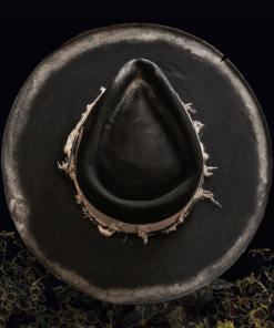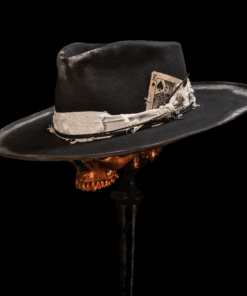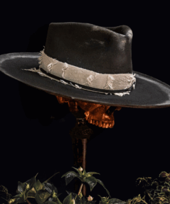 Made from our premium western weight hare felt, black. This teardrop hat with micro curls features silver gilt patina and features a custom Coup of Life card, white jacquard linen wrap, black triple leather rope detail and South African porcupine quill.