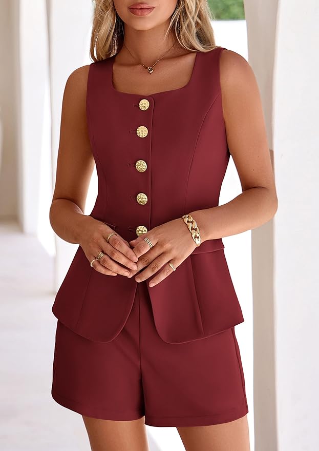 - DESIGN HIGHLIGHTS: This square neck vest and shorts set keeps you cool while looking polished. Decorative gold buttons and faux pockets elevate the design effortlessly, transitioning seamlessly from office to cocktail hour